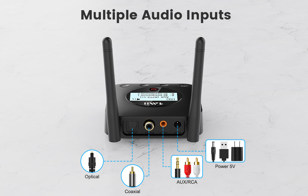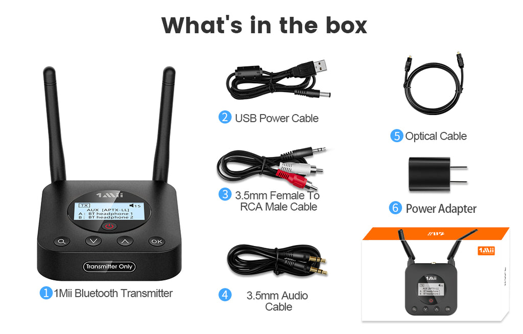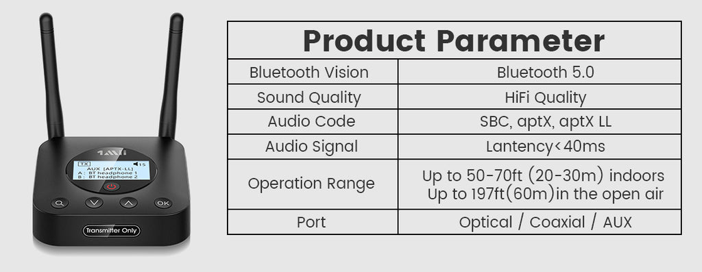 1mii B06tx plus Bluetooth 5.0トランスミッタは、テレビからワイヤレスヘッドセット/スピーカーへのBluetoothアダプターに適しており、画面表示、補助/光/同軸オーディオ入力、プラグアンドプレイ、aptx低遅延を備えたテレビに適しています。