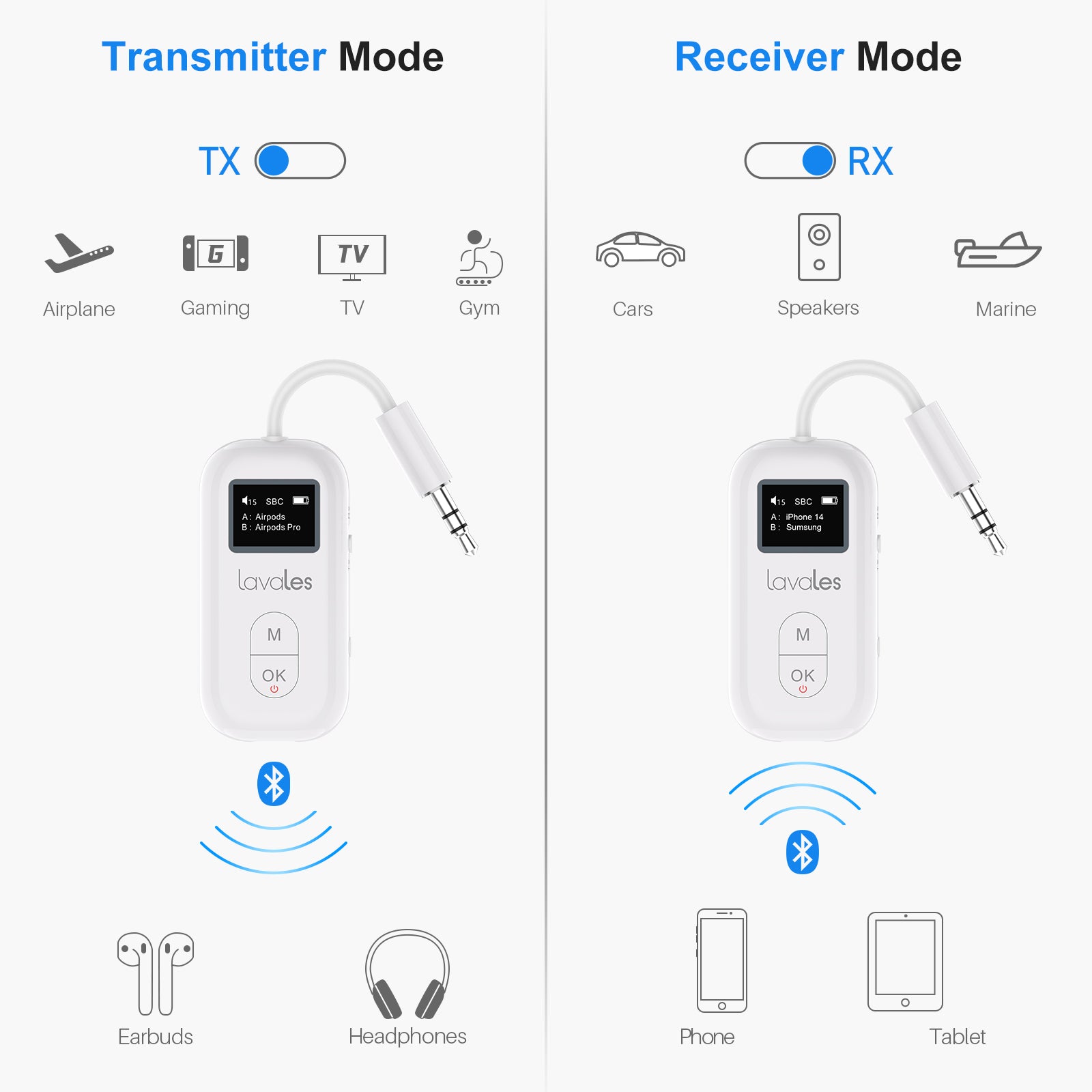 【2-in-1 Transmitter/Receiver】3.5mm wireless adapter is equipped with a high-quality Qualcomm chip and Bluetooth 5.2 version. In transmitter mode, it easily connects non-Bluetooth devices such as airplanes, TVs, and computers. In receiver mode, you can enjoy high-fidelity wireless audio from your speakers.