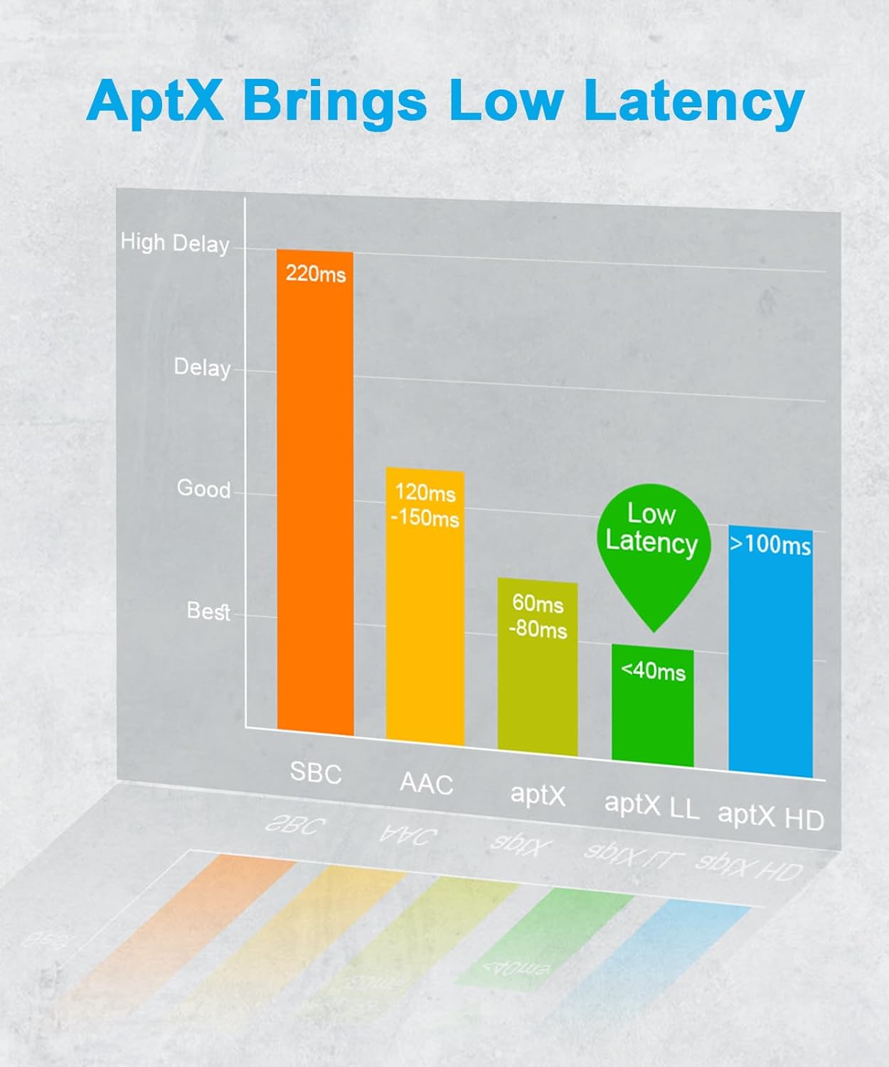 【Low Latency Technology】The adapter supports simultaneous connection with two devices and is compatible with decoding formats such as aptX, aptX-LL, aptX-HD, and aptX-Adaptive. This ensures distortion-free digital sound and ultra-low audio latency, providing you with an immersive audio experience.
