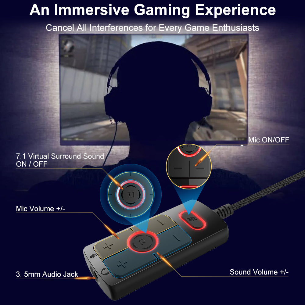 1Mii Gaming USB sound card with 7.1 virtual surrounds sound enhance your gaming headsets and make you quickly sense the voice of directions, footsteps, which will bring you an immersive gaming experience and enjoy your gaming time.